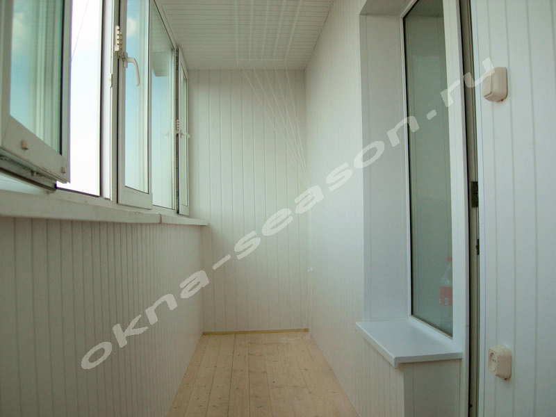 Обшивка лоджий и балконов. Внутреннея отделка белой пластиковой вагонкой.
